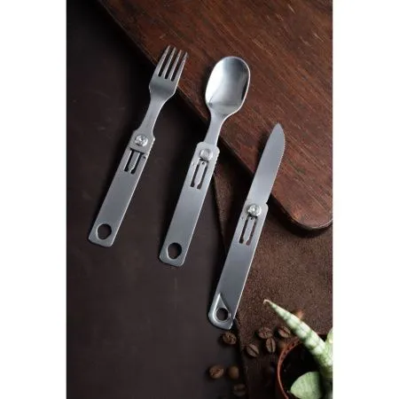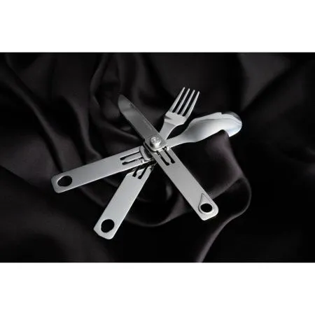 Компактные столовые приборы рассчитаны на использование в условиях туристических походов и иных занятий на свежем воздухе. Складные кухонные приборы имеют удобную конструкцию, которая совмещает в себе сразу три приспособления: нож с серрейторной заточкой, вилку и ложку. Этого набора хватит, чтобы трапезничать на природе. Ложка, вилка и нож легко складываются и раскладываются. Компактный дизайн позволяет сэкономить 50% места для хранения. Комфортные столовые приборы позволят вам наслаждаться процессом употребления пищи в любых условиях. Даже если это происходит далеко от дома.